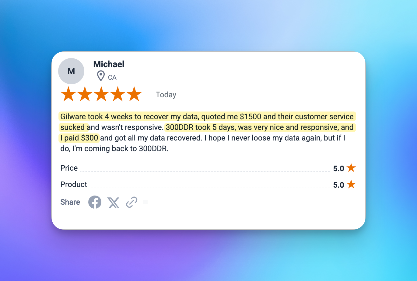 Just recovered ALL data for a customer in 5 days for $300! 💾✨ They were quoted $1500 elsewhere with a 4-week wait and poor service. Professional data recovery doesn't have to be expensive or slow. We prove it every day! 🎯 https://www.shopperapproved.com/reviews/16133?reviewid=213917650&social=1