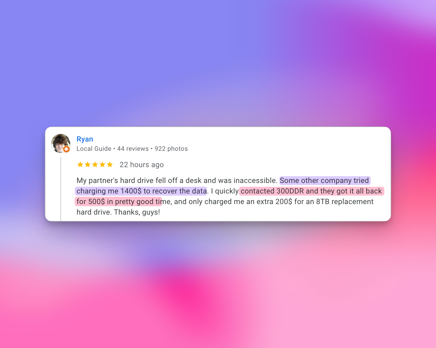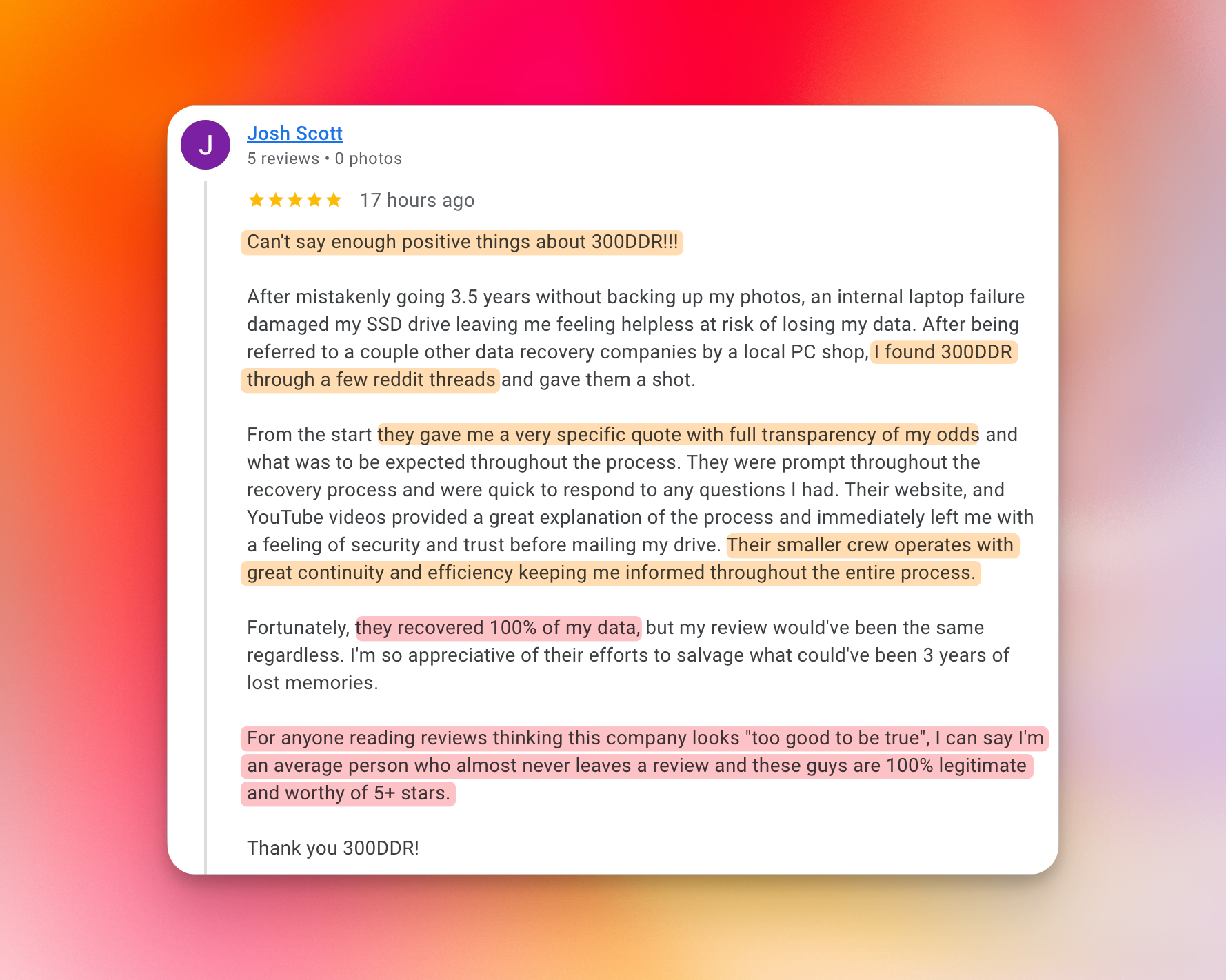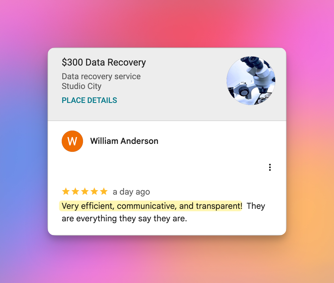 Thrilled to receive this 5-star review! ⭐⭐⭐⭐⭐ Our team prides itself on efficient, transparent service with constant communication. 💾 When you choose $300 Data Recovery, you get affordable excellence and updates every step of the way! ✨ https://www.google.com/maps/contrib/109509145541336708425/plac...Read more